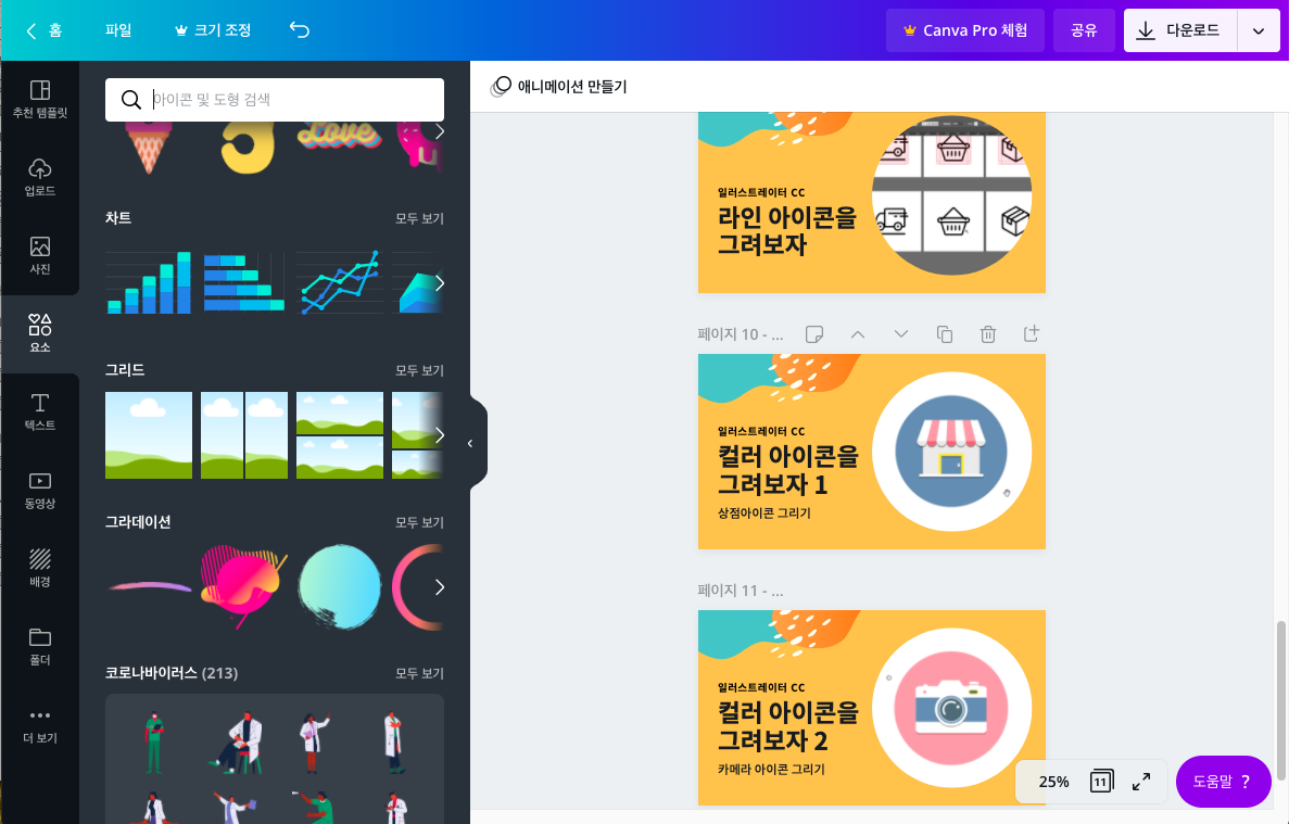 SNS, 유투브, 책커버, 인쇄물 등 수십개의 템플릿이 있고 기본적인 디자인이 되어 있어서 선택한 다음 쉽게 수정해서 사용하면 된다. 폰트, 일러스트, 도형 등 요소들도 드래그래서 넣다 뺐다 하면서 쉽게 디자인 해볼 수도 있고.
