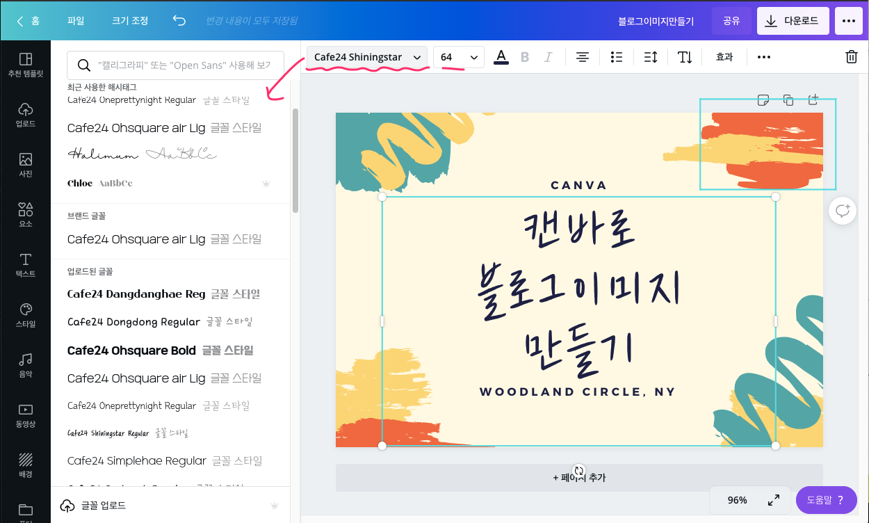 텍스트를 클릭해서 내용을 써넣고 폰트 종류를 변경한다.