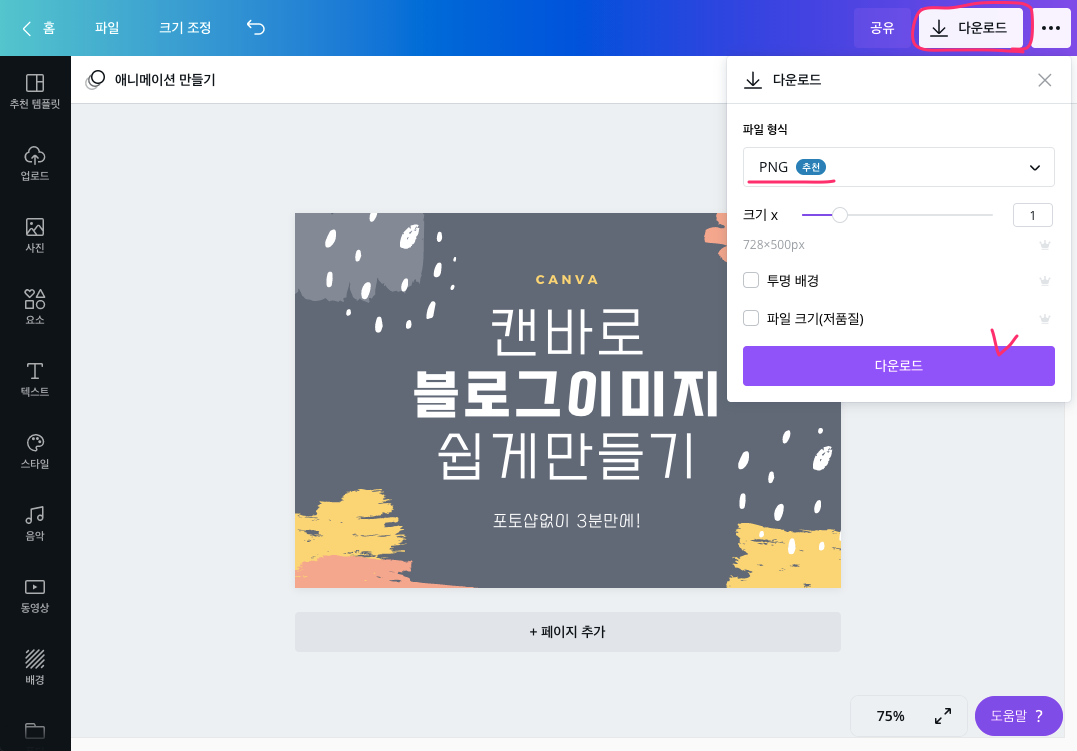 디자인을 완료하고 PNG 이미지로 다운로드하면 내 컴퓨터에 저장됨