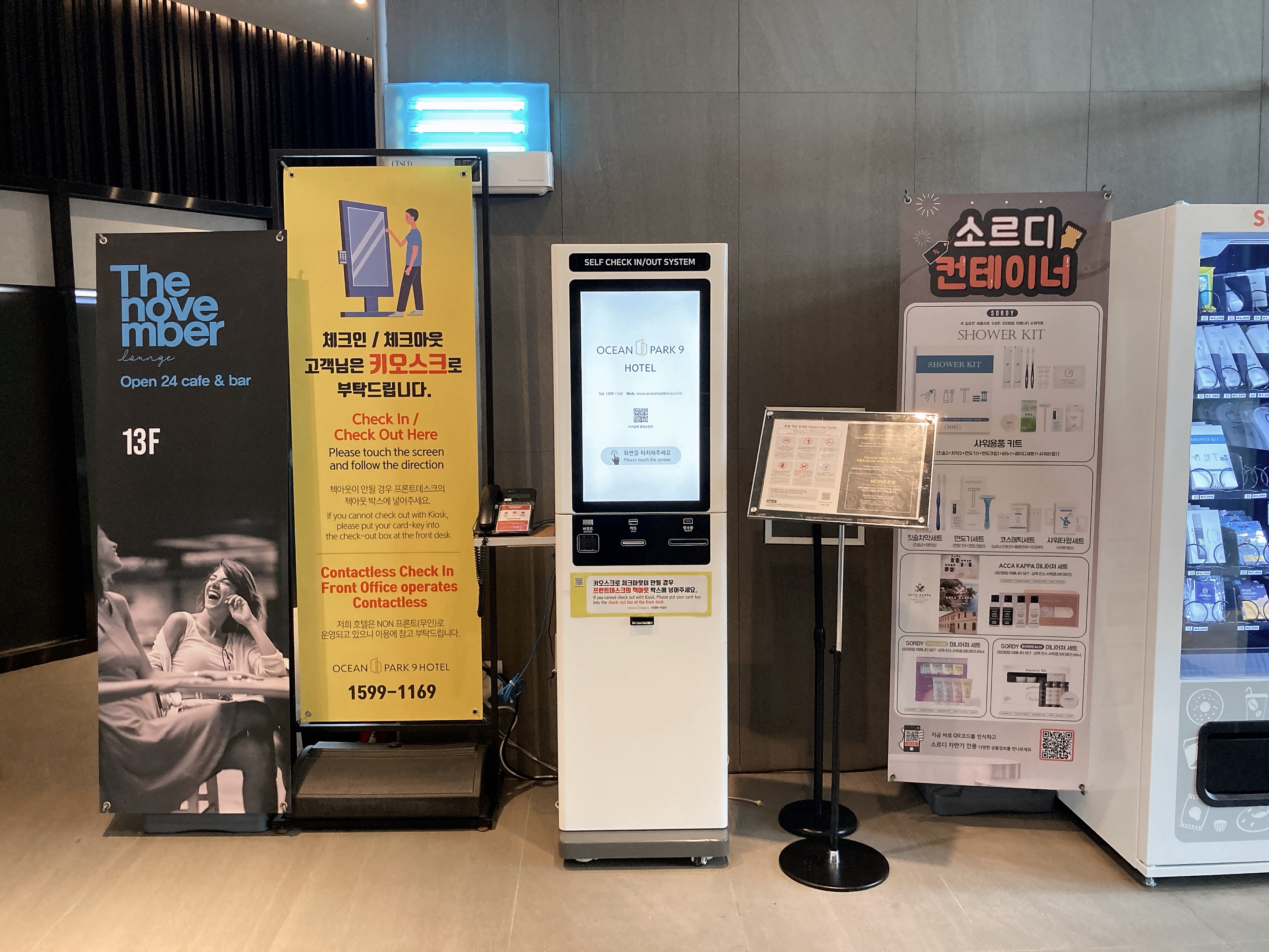 우측에 간단한 용품들을 판다. 이 호텔은 칫솔, 치약이 제공되지 않아서 챙겨가거나 여기서 구매해야 한다.